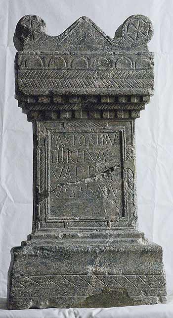 - Pastoribus / Tertius / Valerii / v(otum) s(olvit) l(ibens) m(erito)