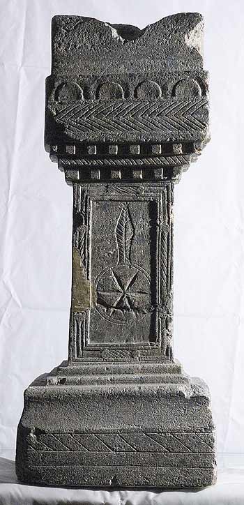 - Volutenpolster (pulvinus) mit eingeritzten Rosetten, dazwischen Giebel. Darunter Band mit eingeritzten Halbkreisen, Band mit geritztem Tannenzweigmuster, darunter Zahnschnitt, tordiertes Band, Zahnschnitt. Schriftfeld profiliert gerahmt, auf der äußeren Leiste Stäbe mit schrägen Ritzlinien. Auf dem Sockel eingritztes Band mit Schrägstrichen. Auf den gerahmten Nebenseiten Griffschalen ?