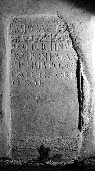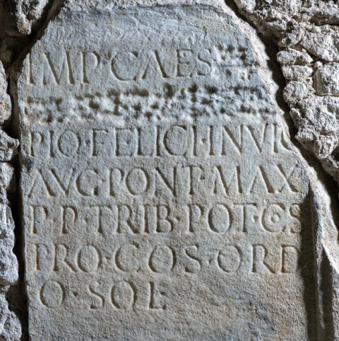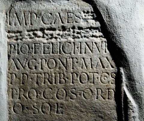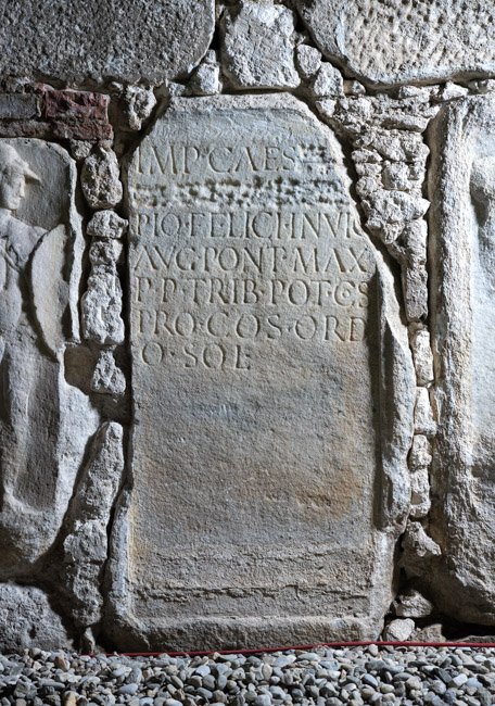 - Imp(eratori) Caes(ari) [[[M(arco) Aur]]]/[[[el(io) Antonino]]] / Pio Felici Invic(to) / Aug(usto) pont(ifici) max(imo) / p(atri) p(atriae) trib(unicia) / pot(estate) co(n)s(uli) / proco(n)s(uli) ord/o Sol(vensium)