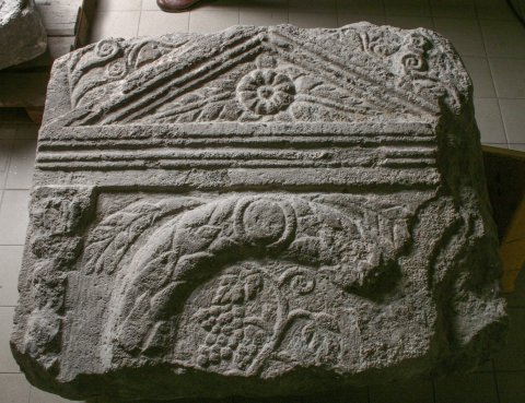 Eingeschriebener Giebel mit Rosette zwischen Blättern, auf den Schrägen Halbpalmetten und Efeuranken.