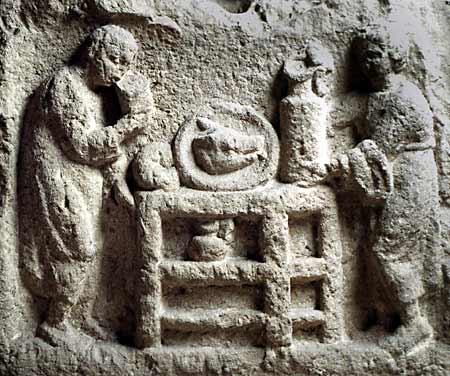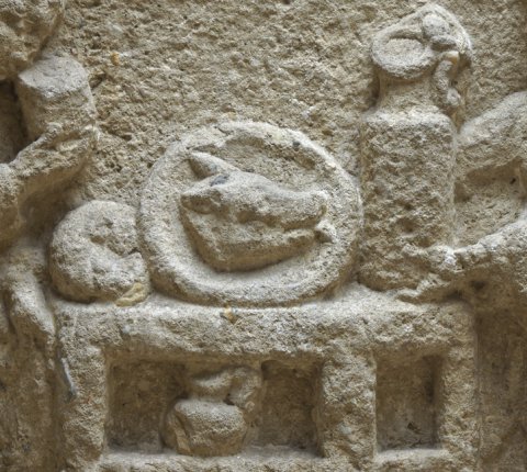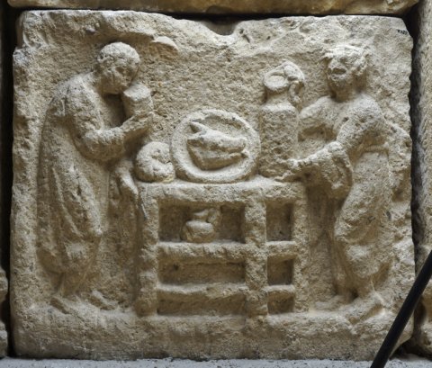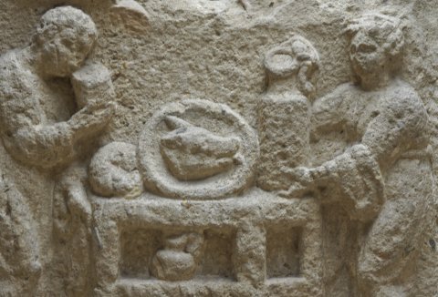 - In Rechteckfeld Tisch mit zwei Fächern, oben Platte mit Schweinskopf und Brot, im oberen Fach Gefäß. Links Mann (Diener) in halblanger Tunica mit Becher, rechts Frau (Dienerin) in gegürtetem Ärmelgewand, in den Händen Kanne. Vorbereitungen für Totenopfer ?