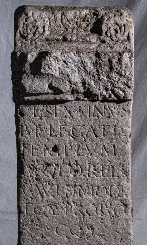 - [------] // Cl(audius) Sextinus / b(ene)f(iciarius) legati / templum / a solo rele/vavit Modes/to et Probo / co(n)s(ulibus)