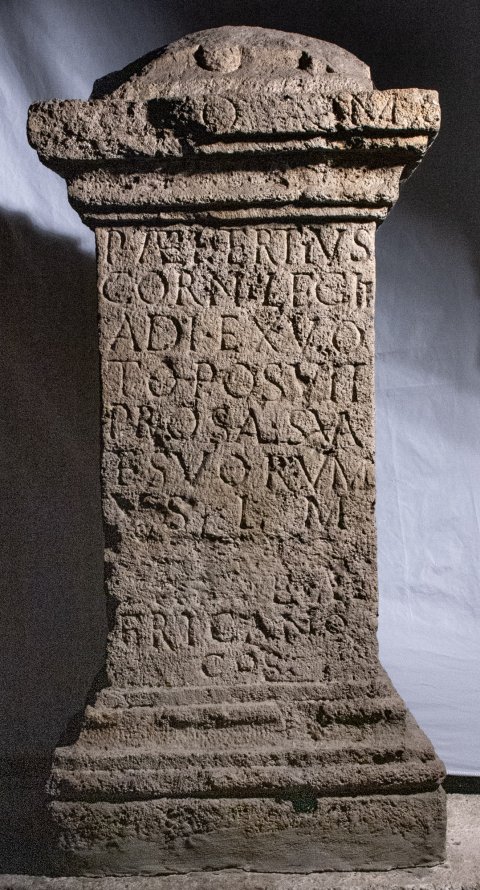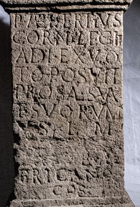 - [I(ovi)] O(ptimo) M(aximo) // P(ublius) Ael(ius) Tertius / corn(icen?) leg(ionis) II / adi(utricis) ex vo/to posuit / pro sal(ute) sua / et suorum / v(otum) s(olvit) l(ibens) m(erito) / [[I[mp(eratore) M]axi]]/[[m]ino Aug(usto)]] et A/fricano / c[o](n)s(ulibus)
