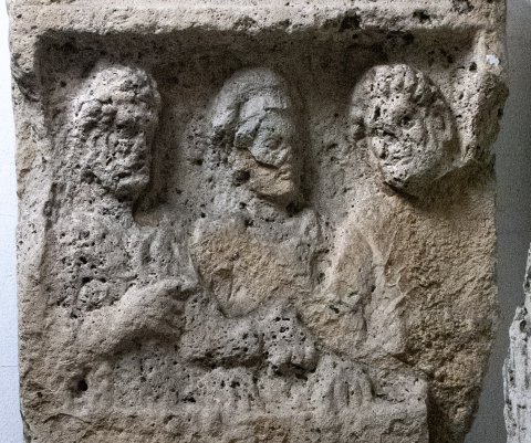 - Giebel mit Rosette, darunter Bildfeld mit Familie. Halbfiguren von drei Erwachsenen und einem Kind: Frau zwischen zwei bärtigen Männern, der linke mit Paenula. Vor der Frau Kind.