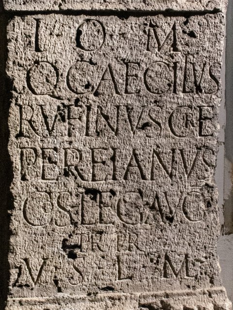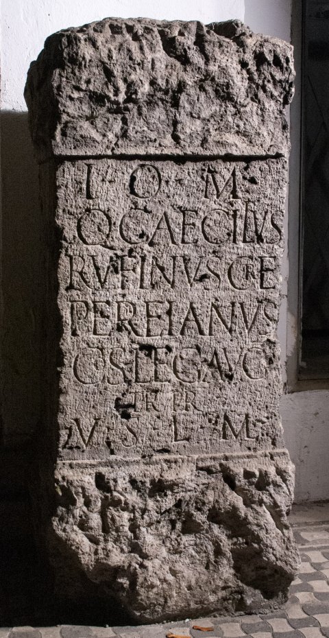 - I(ovi) O(ptimo) M(aximo) / Q(uintus) Caecilius / Rufinus Cre/pereianus / co(n)s(ularis) leg(atus) Aug(ustorum duorum) / pr(o) pr(aetore) / v(otum) s(olvit) l(ibens) m(erito)