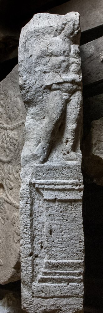 - Eckblock. Mythische Figur (Mars, Heros ?, Genius). Auf der Vorderseite stehende nackte männliche Figur mit Waffen: Schild, Helm und Lanze (spiegelverkehrte Haltung von Nr. 3963), auf der rechten Nebenseite hohes Podest mit nacktem geflügelten Knaben mit Fackel in den Händen.
