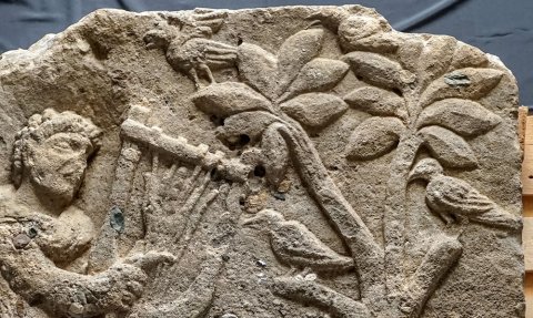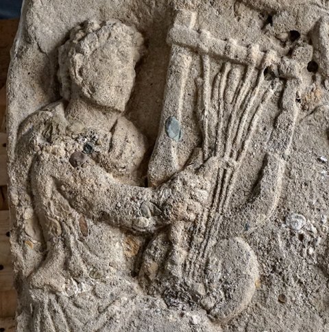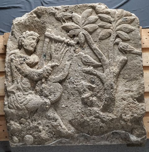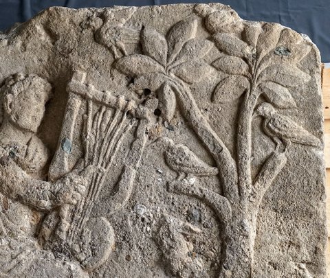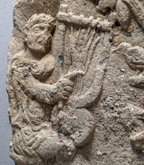 - Mythos, Musikinstrument, Tiere: sitzender Orpheus mit Lyra, rechts Baum mit Vögeln, darunter liegende Hirschkuh.