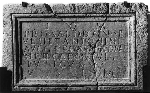 - I(ovi) O(ptimo) M(aximo) / pro sal(ute) dd(ominorum) nn(ostrorum) Se/veri et Antonini / Augg(ustorum) [[et G{a}etae n]] / [[obil(issimi) Caes(aris) C(aius)]] Iul(ius) / Euticus (!) / v(otum) s(olvit) l(ibens) m(erito)