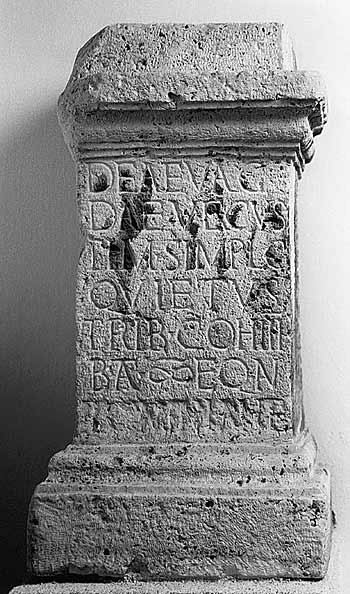 - Deae Vag/daevercus/ti M(arcus) Simplic(ius) / Quietus / trib(unus) coh(ortis) III / Bat(avorum) |(miliariae) eq(uitatae) An/[[toninian(a)e]]