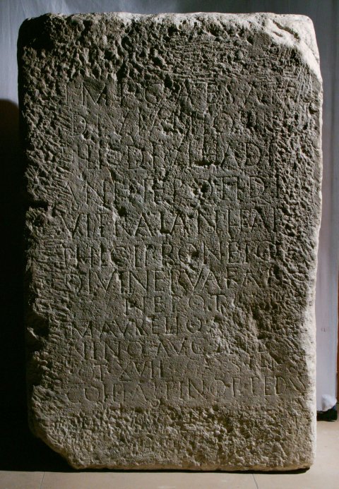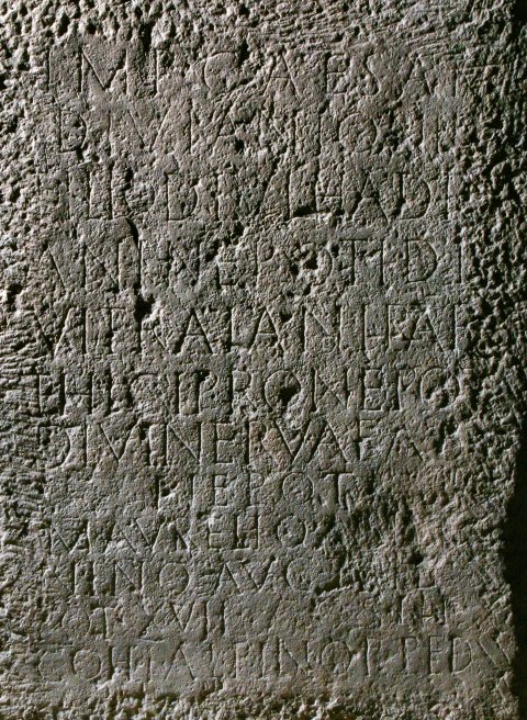 - Imp(eratori) Caesari / divi Antonini / filio divi Hadri/ani nepoti di/vi Traiani Par/thici pronepoti / divi Nervae ab/nepoti / M(arco) Aurelio Anto/nino Aug(usto) trib(unicia) / pot(estate) XVII co(n)s(uli) III / coh(ors) I Alpinor(um) ped(itata)