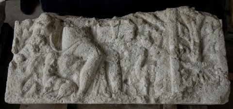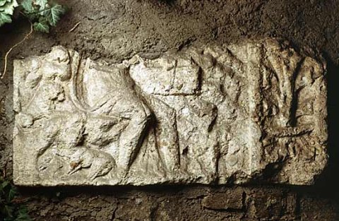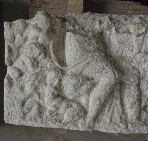 - Mythos: sitzender Orpheus mit Tieren. Rechts Seitenfeld mit Akanthusornament.