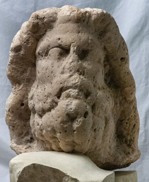 - Nur Kopf einer überlebensgrossen Skulptur erhalten. Stark verwittert, Nase beschädigt.