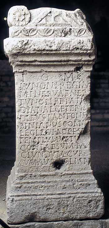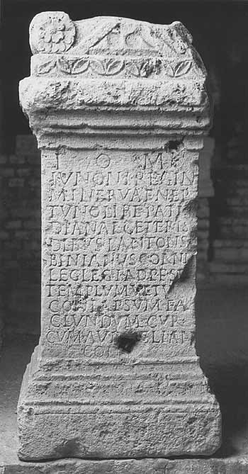 - I(ovi) o(ptimo) m(aximo) / Iunoni Regin(ae) / Minervae Nep/tuno Libe(ri) Patri / Dianae ceterisq(ue) / dibus L(ucius) Anton(ius) Sa/binianus cornic(ularius) / leg(ati) leg(ionis) I Ad(iutricis) p(iae) f(idelis) Sev(erianae) / templum vetust(ate) / conlapsum fa/ciundum cur(avit) / cum Aur(elia) Aeliana / con(iuge)