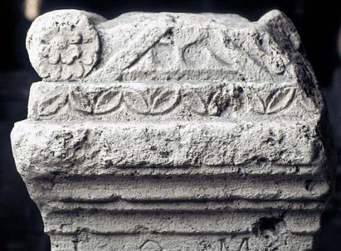 - Volutenpolster (pulvini) mit Rosetten, dazwischen Giebel, darunter Leiste mit Blattfries