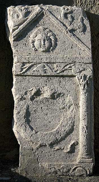 Eingeschriebener Giebel mit Gorgoneion, auf den Schrägen Delphine.