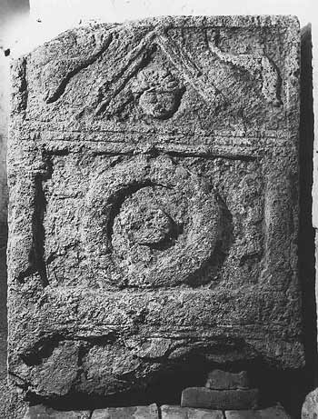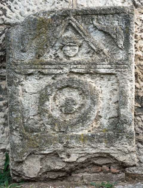 Eingeschriebener Giebel mit Gorgoneion, auf den Schrägen Delphine.