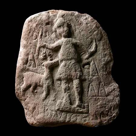 - Mythische Figur : auf flachem Podest stehende Diana im kurzen, gegürteten Gewand, in der Rechten Speer (Pfeil ?), in der Linken Bogen, Köcher über der rechten Schulter. Links neben ihr Hirsch, leere Flächen mit eingeritzten Dreiecken gefüllt.