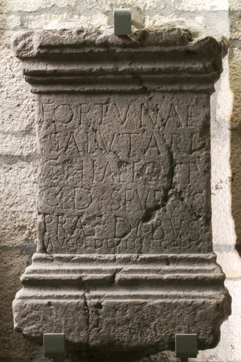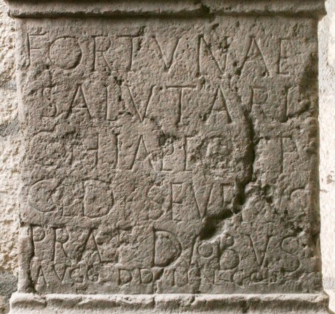- Fortunae / Salutari / coh(ortis) I Alp(inorum) eq(uitatae) P(ublius) / Clod(ius) Severus / praef(ectus) duobus / Augg(ustis) dd(ominis) nn(ostris) co(n)s(ulibus)