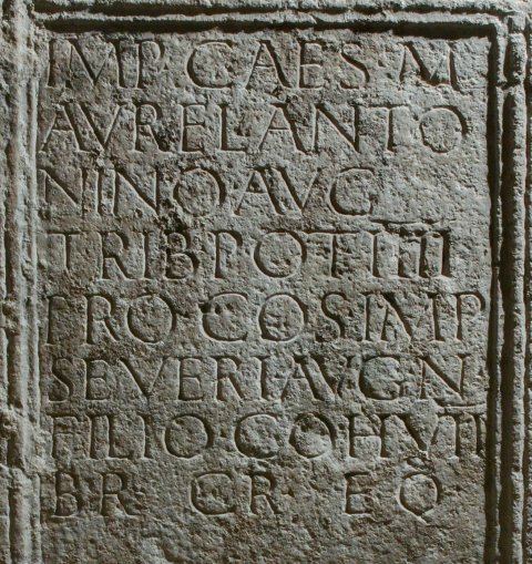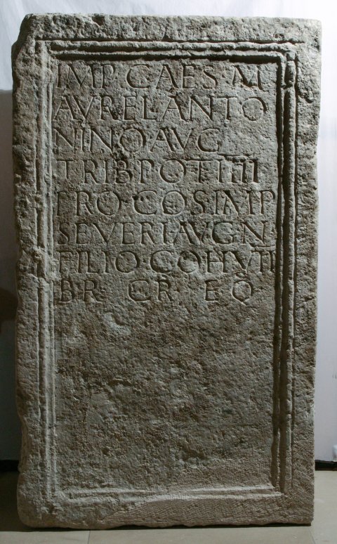 - Imp(eratori) Caes(ari) M(arco) / Aurel(io) Anto/nino Aug(usto) / trib(unicia) pot(estate) IIII / proco(n)s(uli) imp(eratoris) / Severi Aug(usti) n(ostri) / filio coh(ors) VII / Br(eucorum) c(ivium) R(omanorum) eq(uitata)