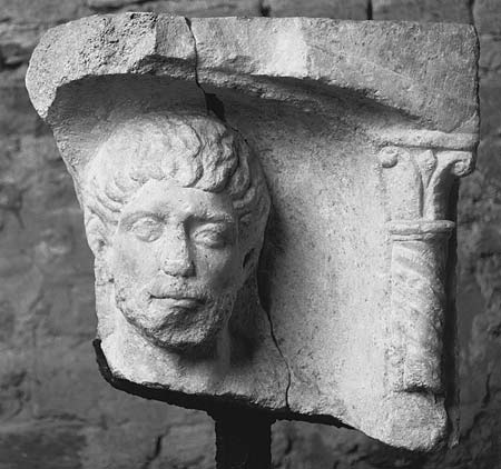 - Unter flachem Bogen auf Säulen mit Spiralkannelluren und Blattkapitell Halbfigur (?) eines Mannes: bärtig, Locken, auf der rechten Schulter Mantel.