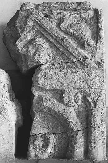 Im Hauptbild zwischen Säulen mit Blattkapitell Kranz, darin Rosette. Im Zwickel zwischen Kranz u. oberem Rand kleine Rosette.