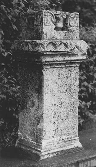 - Bekrönung: zwischen vier Eckakroteren mit stilisierten Palmetten kelchförmige Gefäße mit niedrigem Fuß. Darunter auf der Vorderseite erste Zeile der Inschrift. Auf dem Rand der Deckplatte Blattfries.