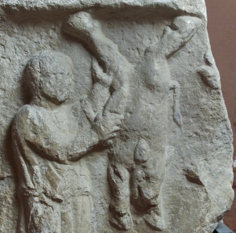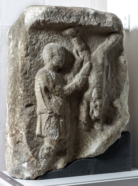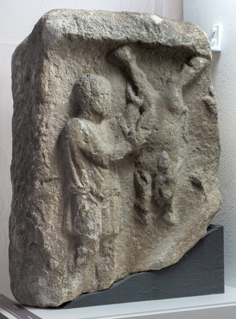 Auf der Innenseite: Mann in kurzer Tunica, der ein aufgehängtes Schwein zerteilt. Dienerin von Reliefwand Nr. 509 zugehörig ? - Kommentar