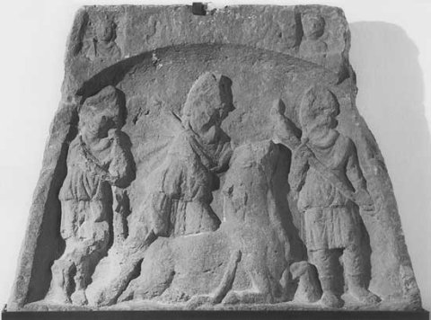 - Mythos (Mithras): trapezförmige Tafel, Bildfeld oben mit flachem Bogen gerahmt. Stiertötung (Tauroktonie) mit Cautes und Cautopates, auf dem oberen Rahmen in Rechteckfeldern links Büste des Sol, rechts der Luna.