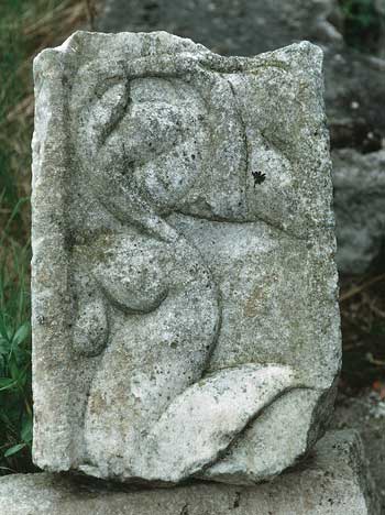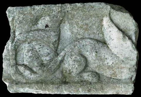 - Zwischenfries mit mythischer Figur : liegender Greif nach rechts, links Reliefrest.