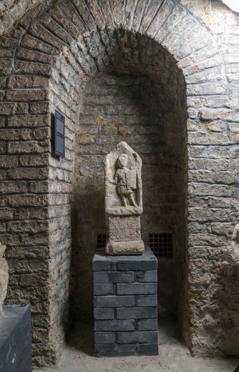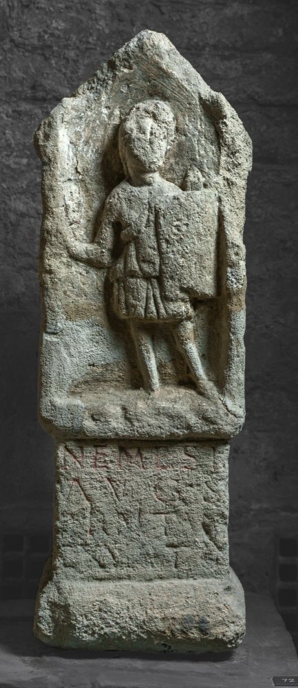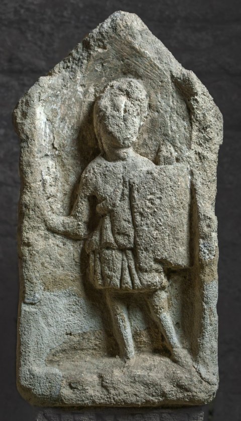 - Mythische Figur: auf altarförmigem Sockel in Giebelnische stehende Nemesis in kurzem Chiton mit Überschlag, rechte Schulter entblößt, in der Rechten Peitsche (?), in der Linken gewölbter eckiger Schild, an der linken Schulter Köcher (?).