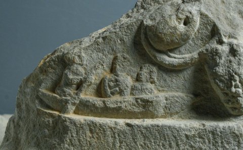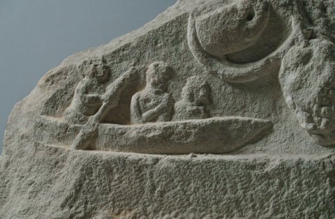 - Mythos (Charon ?): auf der Randleiste kleiner Kahn, links Fährmann mit Ruder, vor ihm Mann und Frau, einander zugewandt. Über dem Kahn und rechts davon Reste von Ranken und Früchten (?).