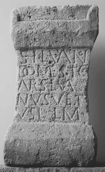 - Silvano / Domestico / Aur(elius) Silva/nus vet(eranus) / v(otum) s(olvit) l(ibens) l(aetus) m(erito)