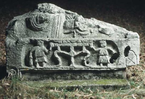 Im Hauptbild Reliefreste von zwei (?) bekleideten Halbfiguren (Ehepaar ?).