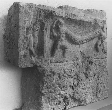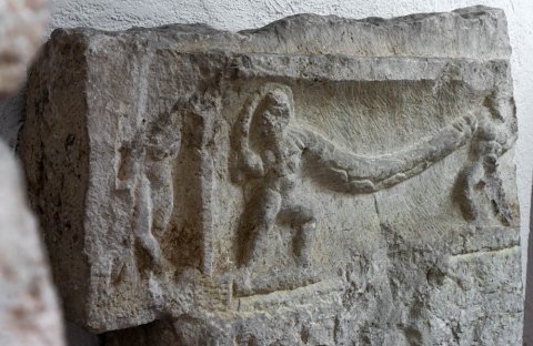 - Mittelfeld mit zwei nackten girlandentragenden Knaben. Links schmales Seitenfeld mit auf gesenkte Fackel gelehntem Trauergenius.