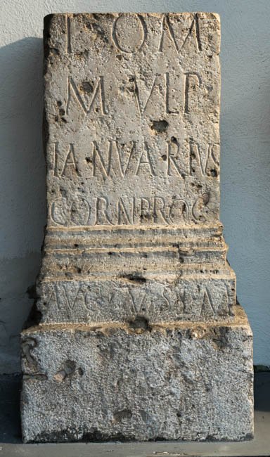 - I(ovi) O(ptimo) M(aximo) / M(arcus) Ulp(ius) / Ianuarius / corn(icularius) proc(uratoris) // Aug(usti) v(otum) s(olvit) l(ibens) m(erito)