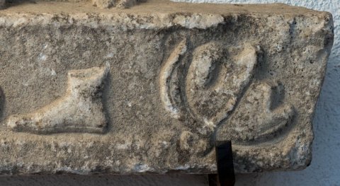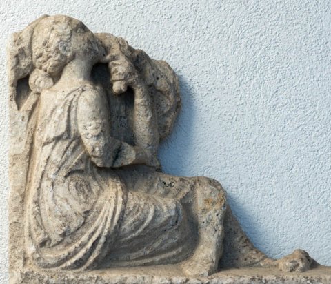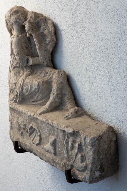 - Im Hauptbild Mythos (?): links auf dem Boden sitzende Frau in Chiton und Mantel, Haar im Nacken geknotet, Kopf nach oben gewandt, linke Hand zum Kinn erhoben (Attribut ?). Vor den Beinen der Frau Rest des rechten Beins einer stehenden (kindlichen ?) Figur. Sockelbild : Fries mit aufgereihten Geräten und Waffen (Spindel und Rocken, Muschel, Fuß mit Sandale, Helm mit Wangenklappen und Helmbusch). Nach Cambi (siehe Lit.) Teil eines Sarkophages.