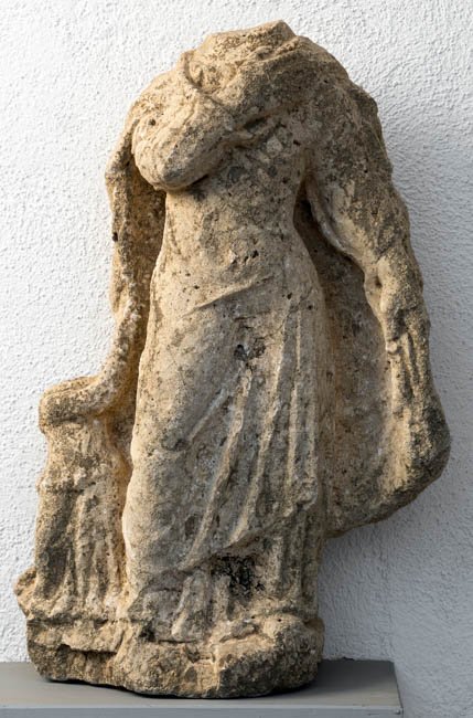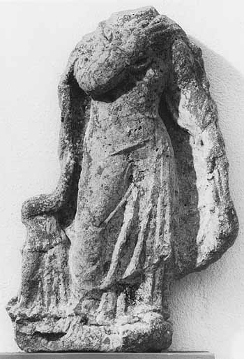 - Stehende Frau in Chiton und Mantel, darüber langer Umhang über Rücken und Schultern. Linke Hand zieht den Umhang zur Seite, die Rechte greift zur linken Schulter. Neben dem rechten Bein steht kleine, nach rechts gedrehte Mädchenfigur im langen Gewand mit Überschlag, beide Hände nach rechts erhoben.