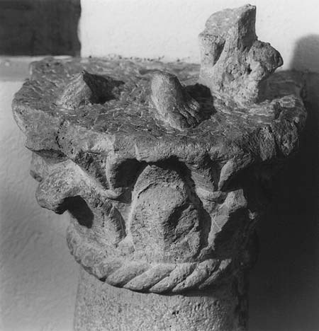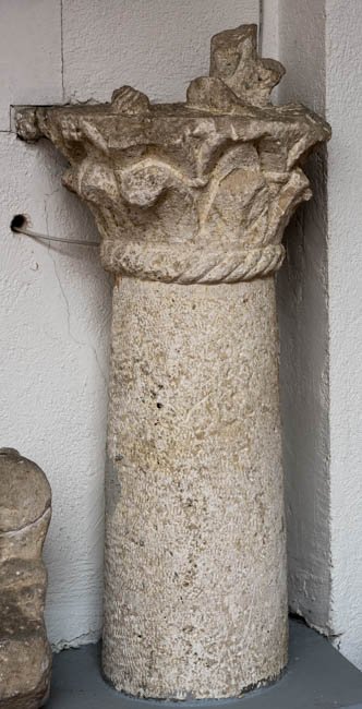 - Mythische Figur (Gott): glatter Säulenschaft, unter dem Blattkapitell tordierter Wulst. Auf dem Kapitell Füße einer stehenden Figur, neben dem linken Fuß Rest eines Attributs oder einer Stütze.
