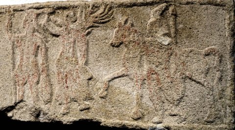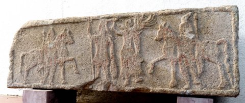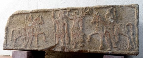 - Mythische Figuren (Dioskuren, Victoria, Jupiter): an den Seiten Dioskur vor seinem Pferd stehend, mit Mantel, Pileus und Speer. Zwischen ihnen Victoria, die einen stehenden Mann mit Szepter bekränzt.