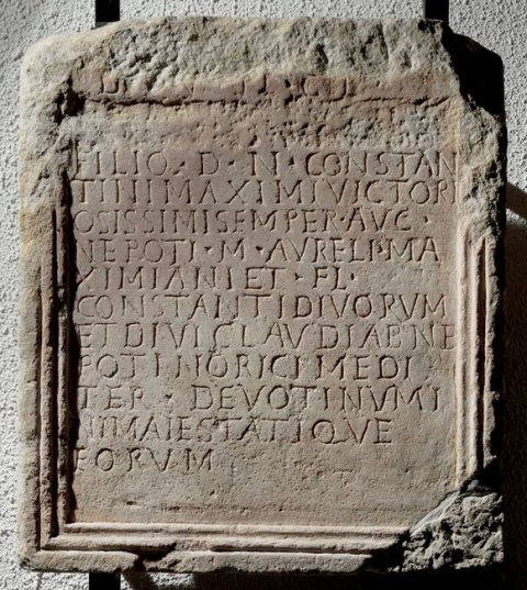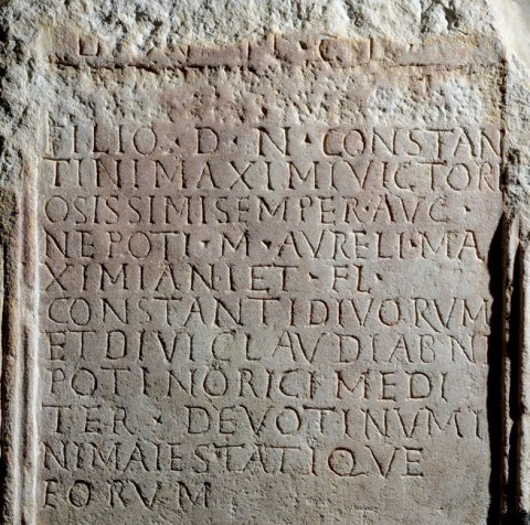 - D(omino) n(ostro) Fl(avio) Cl(audio) / [Constantino / nobilissimo Caes(ari)] / filio d(omini) n(ostri) Constan/tini maximi victori/osissimi semper Aug(usti) / nepoti M(arci) Aureli(i) Ma/ximiani et Fl(avii) / Constanti(i) divorum / et divi Claudi(i) abne/poti Norici medi/ter(ranei) devoti numi/ni maiestatique / eorum