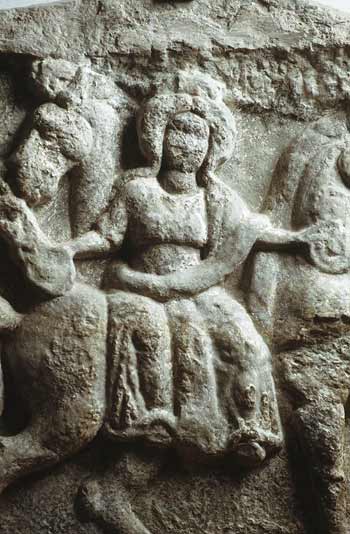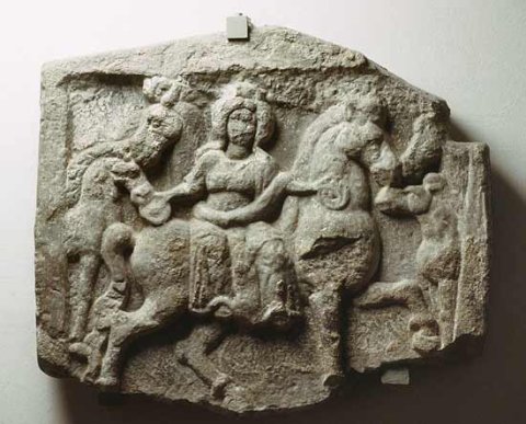- Mythische Figur: Rechteckfeld mit flachem Giebel. Epona mit einem flachen Aufsatz auf dem Kopf, langem Haar, gegürtetem Ärmelgewand und Mantel sitzt frontal auf einem nach rechts gehenden Pferd und reicht mit beiden Händen je eine Schale an zwei Fohlen, deren Vorderteile an beiden Bildseiten erscheinen. Köpfe von zwei Pferden tauchen links hinter der Göttin und am rechten Rand auf.