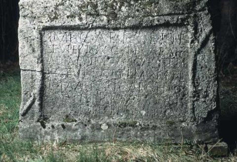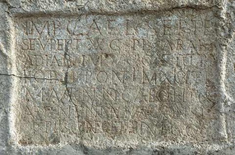 - Imp(erator) Cae/sari) L(ucio) Septe(mio) (!) / Sev(ero) Pert(inaci) Aug(usto) p(atri) p(atriae) Arab(ico) / Adiab(enico) imp(eratori V co(n)s(uli) II tri(bunicia) / pote(state) II pontifi(ci) maximo et / M(arco) Aur(elio) Antoni(no) Caes(ari) coh(ors) I (milliaria) / Aure(lia) Antoniniana nova Se(veriana const(ituta) / Pisone et Iul(iano) co(n)s(ulibus)