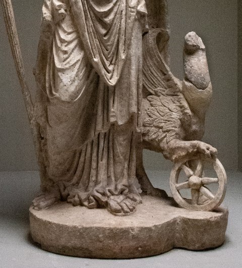 - Mythische Figur : Nemesis Fortuna steht auf einem Podest, bekleidet mit Chiton und Mantel, in der linken Hand ein Globus, in der rechten Hand eine brennende Fackel, auf dem Kopf Diadem und Schleier, Haar in der Mitte gescheitelt, Pupillen gebohrt. Neben dem linken Bein Greif mit einem Rad. Am Mantel rote, am Chiton weiße Farbspuren.