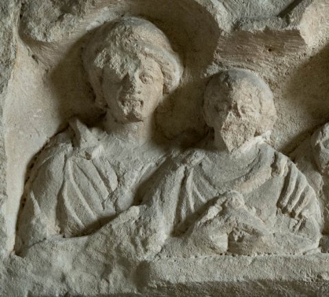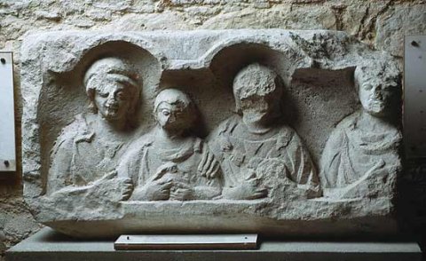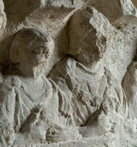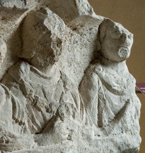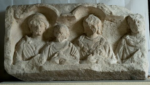 - Familie: unter drei Bögen Brustbilder von drei Erwachsenen und zwei Kindern. Von links einheimische Frau: Haube, Umhang, Fibeln. Knabe: Sagum, Scheibenfibel, in den Händen Hase. Einheimisches Mädchen: offenes kurzes Haar, Umhang, von den Schultern ausgehendes Gehänge mit großen eckigen und ovalen Gliedern, Halsreif. Vor ihr Kopf eines Kleinkindes (?). Mann: bärtig, Sagum, Scheibenfibel.