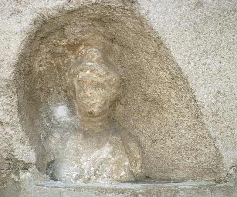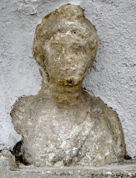 - Mythische Figur (Diana-Nemesis ?): weiblicher Oberkörper mit entblößter rechter Schulter, aufgestecktem Haar, Köcher (?).