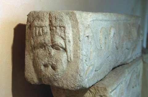 Auf der linken Stirnseite tragische Maske.