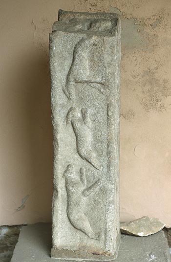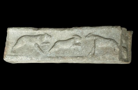- Auf der Vorderseite Tiere (Hase zwischen zwei Hunden). Soffitte mit lyraförmigen Ranken mit Rosetten und Blattornament.