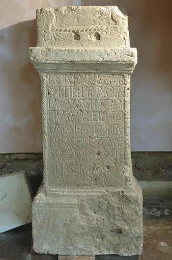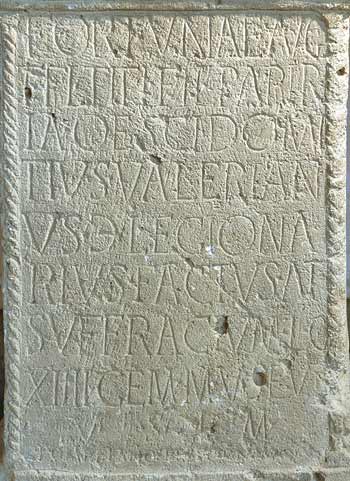 - Fortunae Aug(ustae) / T(itus) Fl(avius) Titi fil(ius) Papir/ia (domo) Oesci Domi/tius Valerian/us |(centurio) legiona/rius factus at(!) / suffragium leg(ionis) / XIIII gem(inae) M(artiae) v(ictricis) Seve(rianae) / v(otum) s(olvit) l(ibens) m(erito) / Po[m]peiano et [Paelignia]no co(n)s(ulibus)
