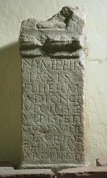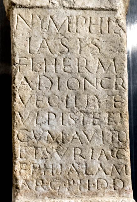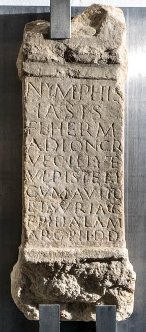 - Nymphis / Iasis / Fl(avius) Herm/adion cir(citor) / vec(tigalis) Illy(rici) et / Ul(pia) Piste ei(us?) / cum Avito et / Suriaco / f(iliis) phialam / arg(enteam) p(ondo) II d(ono) d(ederunt)