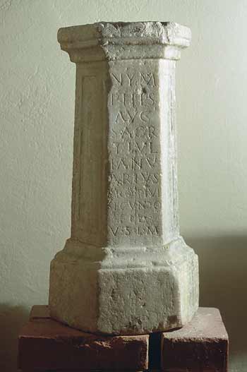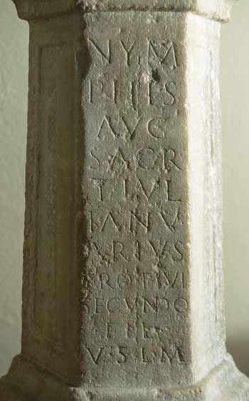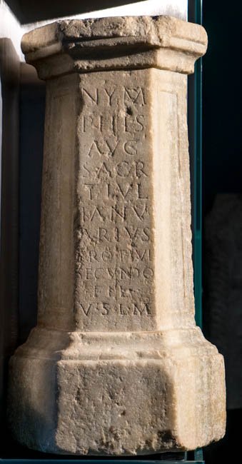 - Nym/phis / Aug(ustis) / sacr(um) / T(itus) Iul(ius) / Ianu/arius / pro T(ito) Iul(io) / Secundo / fil(io) / v(otum) s(olvit) l(ibens) m(erito)